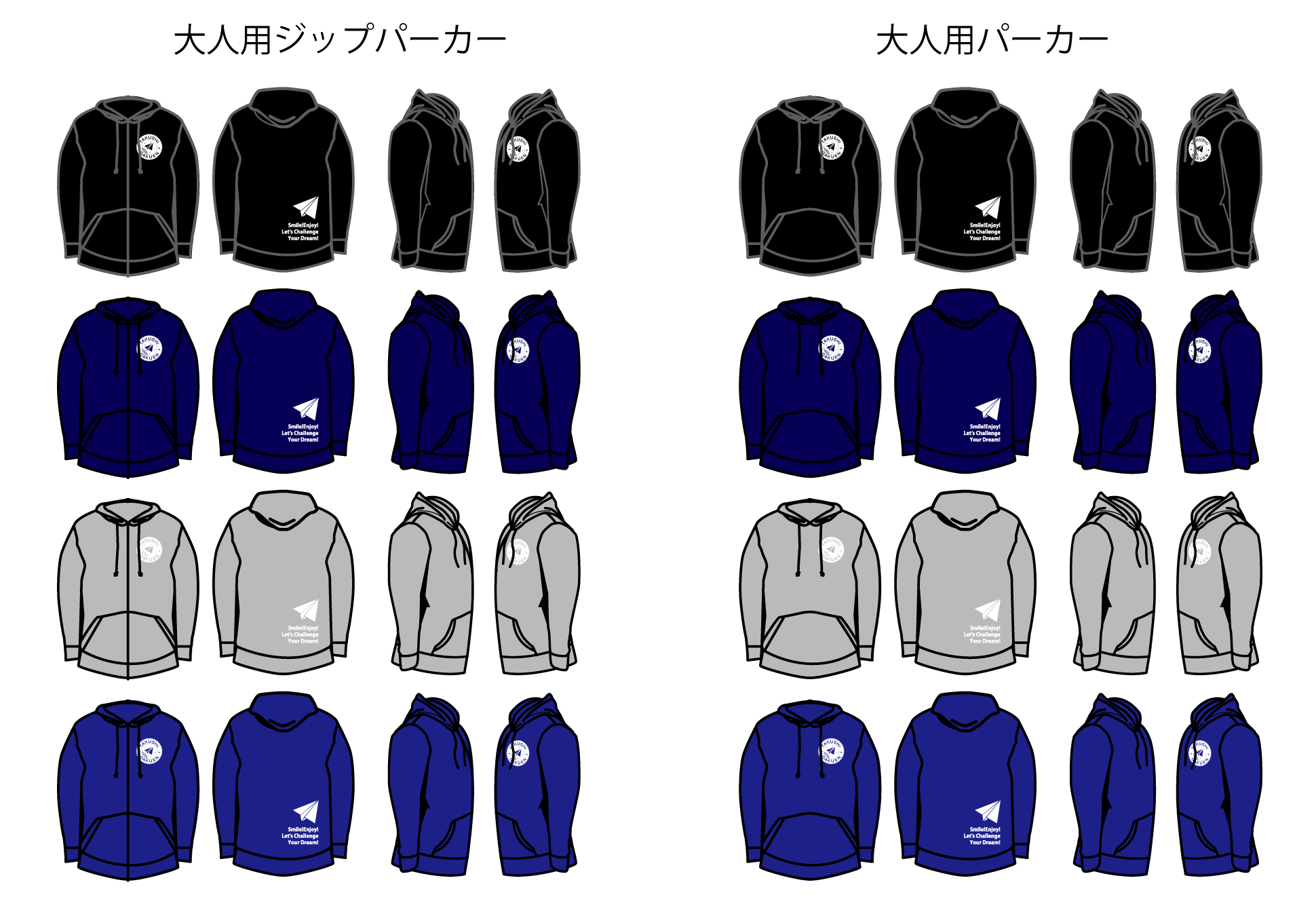 キッズ用サイズ120~サイズ150+サイズWM(ウーマンM)と大人用S~3Lのジップパーカー&パーカーの販売が始まりました。